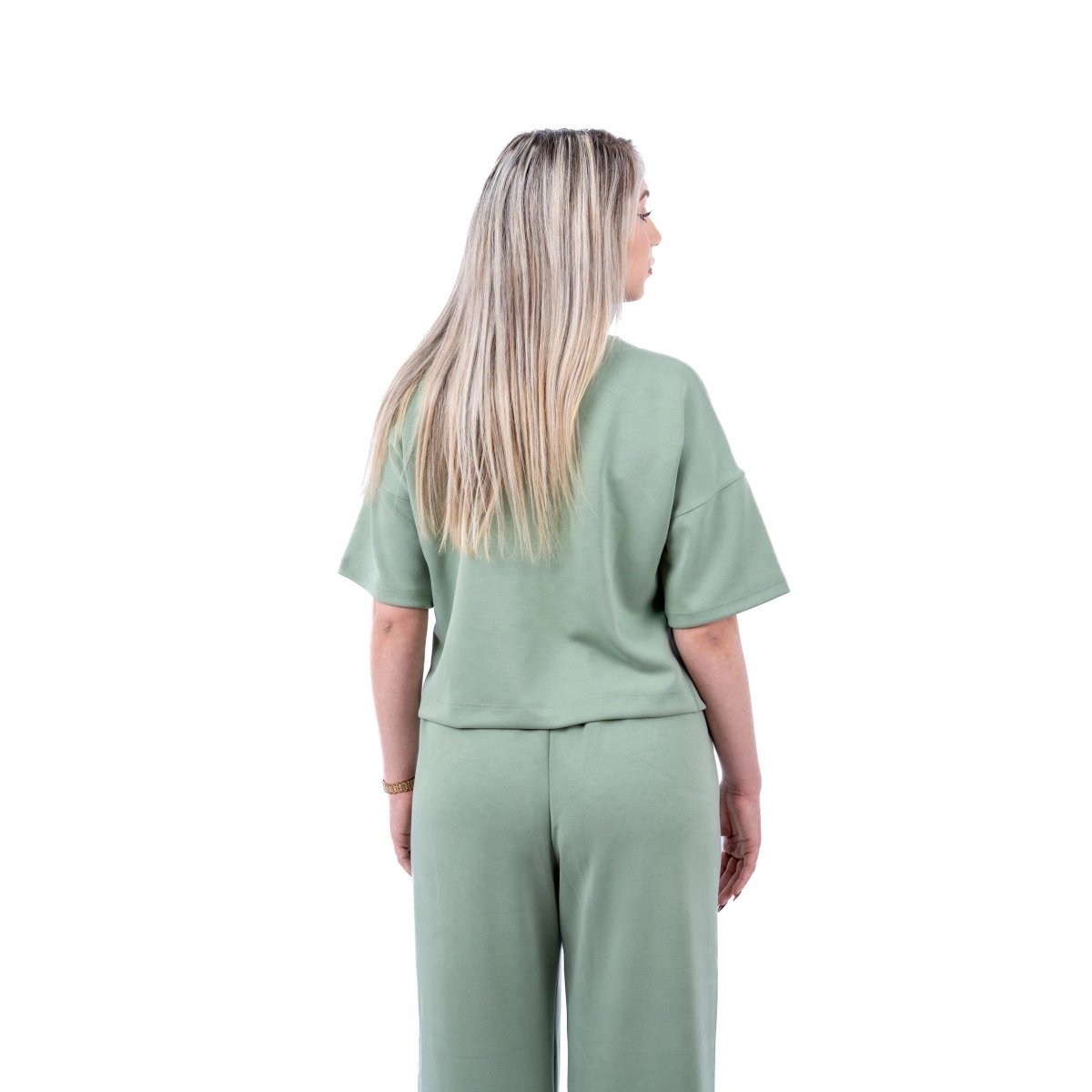 Gornji deo je blago kraći, sa spuštenim ramenima i širim rukavima, dok donji deo ima komforan kroj sa elastičnim pojasom koji prati liniju tela bez stezanja.